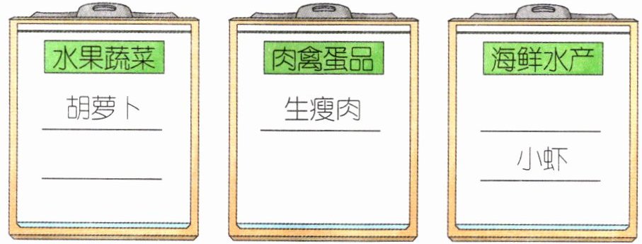 1 获取信息 乐乐想在超市的不同区域购买乌龟的食物,请你结合【材料一】帮他整理购物清单,并填写在横线上。(2 分)