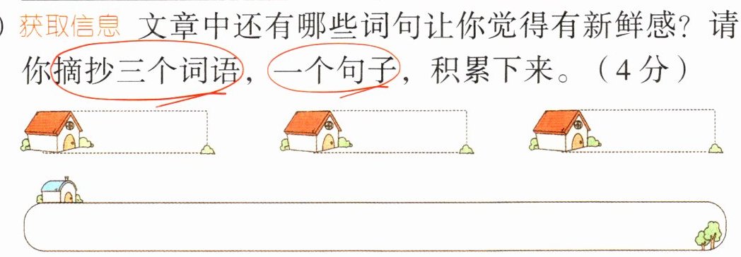 (3)获取信息 文章中还有哪些词句让你觉得有新鲜感?请你摘抄三个词语,一个句子,积累下来。(4分)
