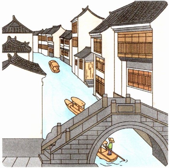 小镇的早晨是安静的。淡淡的霞光下,河面闪烁着一片片银鳞。河水清得透明,好像一条丝带,静静地和街道并行穿过小镇。沿街的河边停满了各式各样的小船,一只紧挨着一只。两座拱形的石桥遥遥相对,坐落在镇两头。不时有一只小船从半月形的桥洞中悄悄钻出来,再从河上轻轻漂过。船虽然驶远了,但船工哼的小调,还在河上轻轻荡漾。