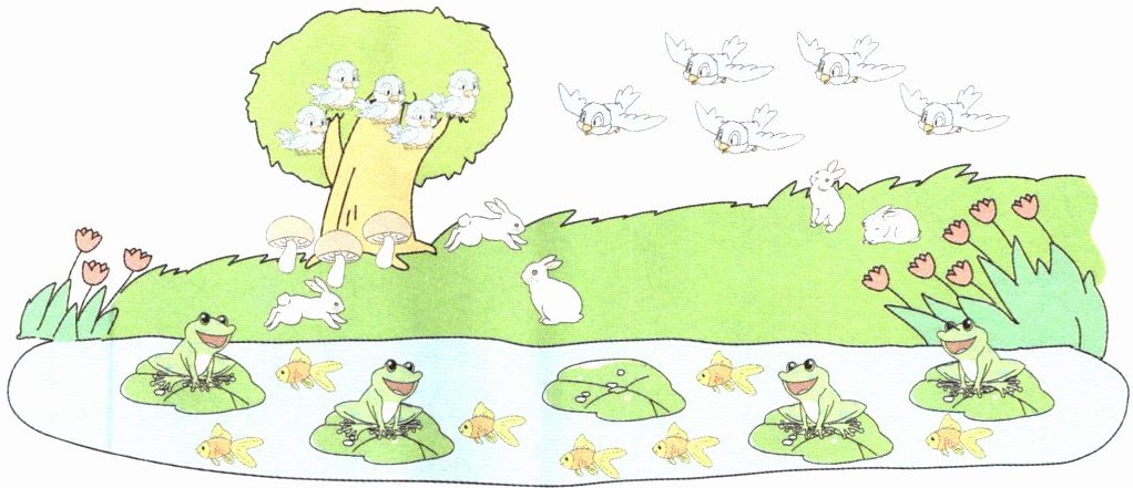 树上有(5 6)只小鸟,树下有(3 4)朵蘑菇。