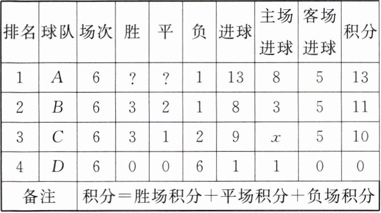 14. 下表是某赛季足球联赛第一阶段小组赛(该小组共四个队,每个队分别与其他三个队进行主客场比赛各一场,即每个队要进行 6 场比赛)积分表的一部分.