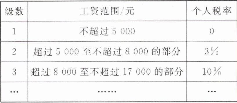 例2 依法纳税是公民应尽的义务.根据国家个人所得税率标准,月工资超过5000元时,需要缴纳个人所得税,税率如下表所示: