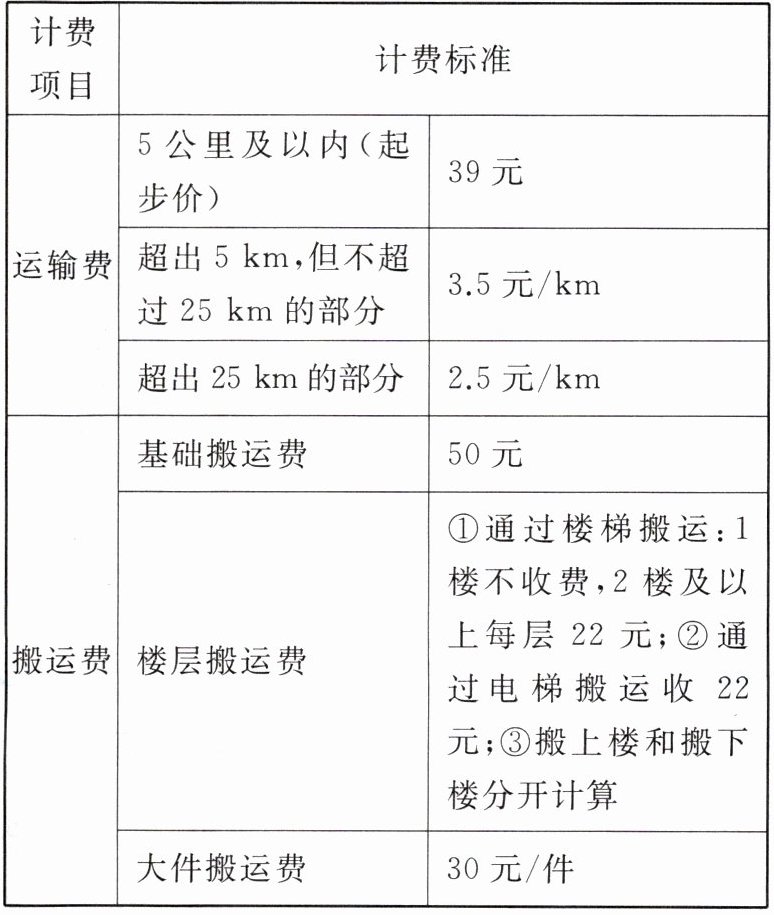 (2)小甬家要从村里的1楼搬迁到15km外的9楼电梯房,且有3件大件家具,则需要多少元的搬家费用?