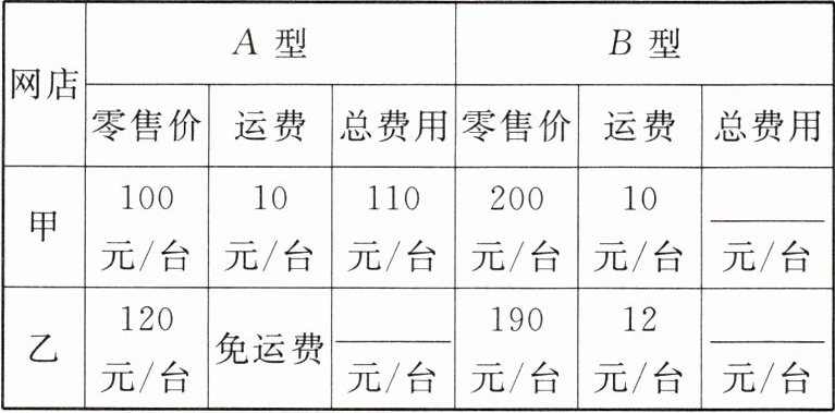 6. 甲、乙两家网店分别出售A型、B型两种取暖器,零售价及运费如下表所示: