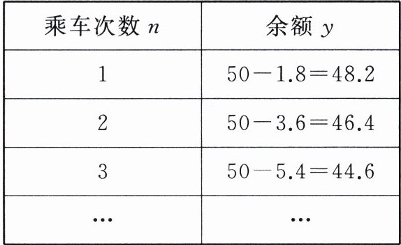 (2)用式子表示张阿姨用公交卡的乘车次数$n$与余额$y$的关系.