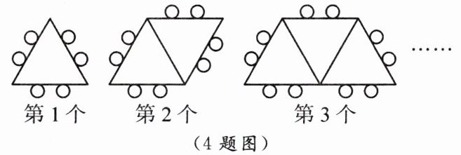 4. 如图,小明将小圆圈和等边三角形按照一定规律摆成图形,其中第1个图形中有1个三角形和6个小圆圈,第2个图形中有2个三角形和8个小圆圈,第3个图形中有3个三角形和10个小圆圈……则第12个图形中有