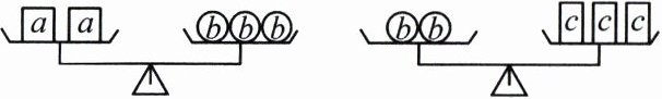 【解析】:由左天平得2a=3b,即a=3b/2;由右天平得2b=3c,即b=3c/2。将b=3c/2代入a=3b/2,得a=3*(3c/2)/2=9c/4,故4a=9c。
