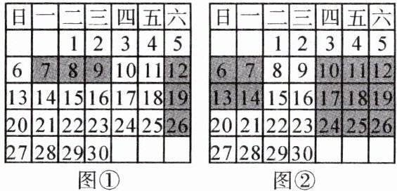16. (1) 图①是某年 11 月份的日历,用 $1 × 3$ 的长方形框出 3 个数。如果任意框出一横行左右相邻的 3 个数,设最小的为 $x$,用含 $x$ 的式子表示这 3 个数的和是