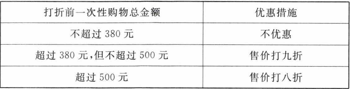 ②$360 ÷ (80 × 0.9)=5$(件).第二天只购买甲种商品,设购进甲种商品$y$件.分以下两种情况讨论:①$0.9 × 60y=432$,解得$y=8$.②$0.8 × 60y=432$,解得$y=9$。答:小明这两天在该商场购买的甲、乙两种商品一共$13$件或$14$件.