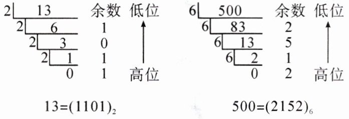 8. 十进制整数转换为二进制整数通常采用除 2 取余法,即用 2 连续除十进制数,直到商为 0,逆序排列余数即可得到二进制数.同样,十进制数转换为六进制数可用除 6 取余法.下图是将十进制数 13 和 500 分别转换为二进制数和六进制数的方法,参照该方法将十进制数 2000 转换为八进制数是