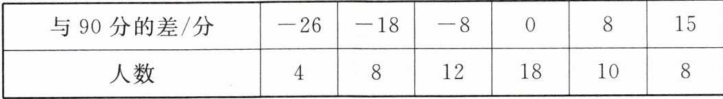 (3)( - 26) × 4 + ( - 18) × 8 + ( - 8) × 12 + 0 × 18 + 8 × 10 + 15 × 8 = - 144(分),(90 × 60 - 144) ÷ 60 = 87.6(分).答:该班这次周练的平均成绩为87.6分.