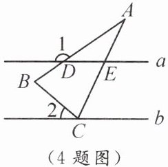 4. 如图,在 $ \triangle ABC $ 中,$ AB = AC $,$ \angle A = 30^{\circ} $,直线 $ a // b $,顶点 $ C $ 在直线 $ b $ 上,直线 $ a $ 交 $ AB $ 于点 $ D $,交 $ AC $ 于点 $ E $.若 $ \angle 1 = 145^{\circ} $,则 $ \angle 2 $ 的度数是(