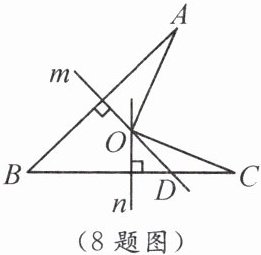 8. 如图,线段 $ AB $,$ BC $ 的垂直平分线 $ m $,$ n $ 相交于点 $ O $.若 $ \angle ODC = 134^{\circ} $,则 $ \angle AOC $ 的度数为(