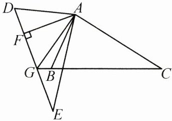 22. (8 分)如图,在$\triangle ABC$和$\triangle ADE$中,$\angle E = \angle C$,$DE = BC$,$EA = CA$,过$A$作$AF \perp DE$于点$F$,$DE$交$CB$的延长线于点$G$,连接$AG$。