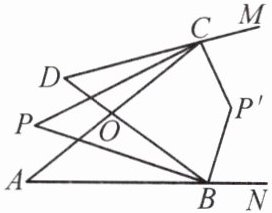 8. 如图,$ AC $,$ BD $ 相交于点 $ O $,$ BP $,$ CP $ 分别平分 $ \angle ABD $,$ \angle ACD $,$ BP' $,$ CP' $ 分别平分 $ \angle ABD $ 的邻补角 $ \angle DBN $,$ \angle ACD $ 的邻补角 $ \angle ACM $。