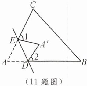 11. 如图,在折纸活动中,小明制作了一张$△ABC$纸片,点$D$,$E$分别在边$AB$,$AC$上,将$△ABC$沿着$DE$折叠压平,点$A$与点$A'$重合.若$∠A=65^{\circ}$,则$∠1+∠2$的度数是