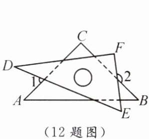 12. 如图,小明把一副含$45^{\circ}$,$30^{\circ}$角的直角三角尺重叠摆放,其中$∠C=∠F=90^{\circ}$,$∠A=45^{\circ}$,$∠D=30^{\circ}$,则$∠1+∠2$的度数是