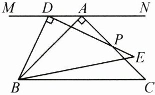 21. (6分)如图,在等腰直角三角形$ABC$中,$\angle BAC = 90^{\circ}$,$AB = AC$,直线$MN$过点$A$且$MN// BC$,以$B$为一个锐角顶点作直角三角形$BDE$,$\angle BDE = 90^{\circ}$,且点$D$在直线$MN$上(不与点$A$重合),$DE$与$AC$交于点$P$.求证:$BD = DP$.