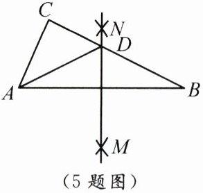 5. 如图,在$ \triangle ABC $中,分别以点$ A $和点$ B $为圆心,大于$ \frac{1}{2}AB $的长为半径画弧,两弧相交于点$ M $,$ N $,作直线$ MN $,交$ BC $于点$ D $,连接$ AD $.若$ \triangle ADC $的周长为10,$ AB = 7 $,则$ \triangle ABC $的周长为()