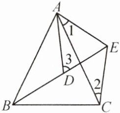 9. 如图,$ AB = AC $,$ AD = AE $,$ BD = CE $,且 $ B $,$ D $,$ E $ 三点在同一条直线上.求证:$ \angle 3 = \angle 1 + \angle 2 $.