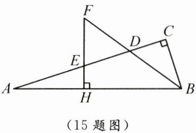 15. 如图,在Rt△ABC中,$ \angle C = 90^{\circ} $,BD是角平分线,E是AD上一点,过点E作$ FH \perp AB $,垂足为H,交BD的延长线于点F.若$ \angle F = 54^{\circ} $,则$ \angle FED $的度数是.