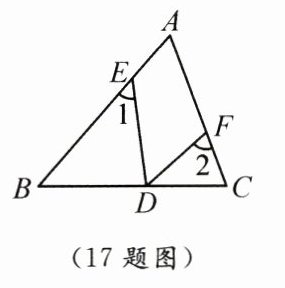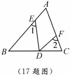 17. 如图,在△ABC中,$ \angle A = 62^{\circ} $,E,D,F分别是边AB,BC,AC上的点.若$ \angle 1 = \angle B $,$ \angle 2 = \angle C $,则$ \angle EDF $的度数是.
