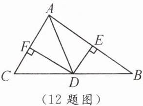 12. 如图,在$\triangle ABC$中,$AD$是中线,$DE\perp AB$,垂足为$E$,$DF\perp AC$,垂足为$F$.若$AB=6$,$AC=4$,则$\dfrac{DE}{DF}$的值是