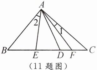 11. 如图,$D$是$\triangle ABC$的边$BC$上任意一点,$AE$是$\angle BAD$的平分线,$AF$是$\angle CAD$的平分线.若$\angle 1+\angle 2=44^{\circ}$,则$\angle B+\angle C=$