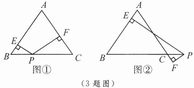 3. 如图,在 $\triangle ABC$ 中,$AB = AC = 10$,$\triangle ABC$ 的面积为 $48$. $P$ 是边 $BC$ 所在直线上一动点,$PE \perp AB$ 于点 $E$,$PF \perp AC$ 于点 $F$.