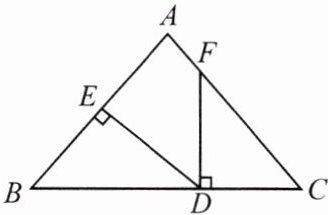 (2)$\because DE \perp AB$,$DF \perp BC$,$\therefore \angle B + \angle BDE = \angle EDF + \angle BDE = 90^{\circ}$,$\therefore \angle B = \angle EDF$。由