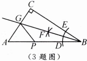 3. 如图,在Rt△ABC中,∠C=90°,利直尺和圆规在BC,BA上分别截取BE,BD,使BE=BD;分别以点D,E为圆心,以大于$\frac{1}{2}DE$的长为半径作弧,两弧在∠CBA内相交于点F;作射线BF交AC于点G.若CG=1,P为AB上一动点,则GP的最小值为(
