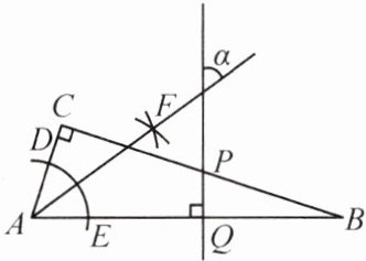 1. 如图,在Rt△ABC中,∠C=90°,∠B=20°,PQ⊥AB于点Q,交BC于点P.按以下步骤作图:①以点A为圆心,适当的长度为半径作弧,分别交AC,AB于点D,E;②分别以点D,E为圆心,以大于$\frac{1}{2}DE$的长为半径作弧,两弧相交于点F;③作射线AF.若AF与PQ的夹角为α,则α的度数是