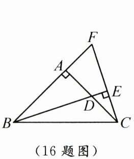 16. 如图,在$\triangle ABC$中,$\angle BAC = 90^{\circ}$,$AB = AC$,$D$是$AC$边的中点,$CE \perp BD$,交$BD$的延长线于点$E$,交$BA$的延长线于点$F$.若$BF = 12$,则$\triangle FBC$的面积为.