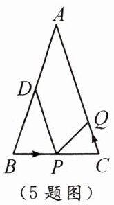 5. 如图,在△ABC 中,∠B = ∠C,AB = AC = 24 cm,BC = 16 cm,D 为 AB 的中点,点 P 在线段 BC 上以 4 cm/s 的速度由点 B 向点 C 匀速运动,同时,点 Q 在线段 CA 上由点 C 向点 A 匀速运动.当点 Q 的运动速度为