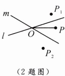 2. 如图,直线 $ l $,$ m $ 相交于点 $ O $,$ P $ 为这两直线外一点,且 $ OP = 2.8 $. 若点 $ P $ 关于直线 $ l $,$ m $ 的对称点分别是 $ P_1 $,$ P_2 $,则 $ P_1P_2 $ 之间的距离可能是()