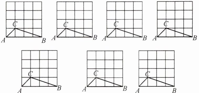 7. 在 $ 4 × 4 $ 的正方形网格图中,$ \triangle ABC $ 的顶点均在格点上,请你画出 $ \triangle DEF $,使 $ \triangle DEF $ 与 $ \triangle ABC $ 关于某直线成轴对称,且点 $ D $,$ E $,$ F $ 均在格点上. 请在下面的图中画出 $ 7 $ 种满足条件的 $ \triangle DEF $.