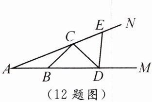 12. 如图,点$B$,$D$在射线$AM$上,点$C$,$E$在射线$AN$上,且$AB = BC = CD = DE$.若$\angle EDM = 84^{\circ}$,则$\angle A$的度数为