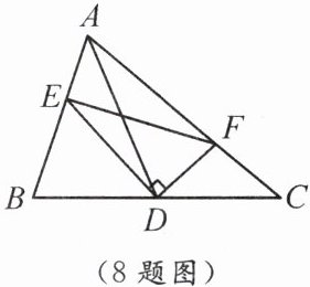 8. 如图,$AD$是$\triangle ABC$的中线,点$E$,$F$分别在$AB$,$AC$上,且$DE\perp DF$,则$BE + CF$与$EF$的大小关系是(