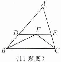 11. 如图,在 $\triangle ABC$ 中,$\angle ABC$ 与 $\angle ACB$ 的平分线交于点 $F$,过点 $F$ 作 $DE// BC$ 交 $AB$ 于点 $D$,交 $AC$ 于点 $E$. 有下列结论: