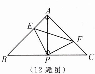 12. 如图,在 $\triangle ABC$ 中,$AB = AC$,$\angle BAC = 90^{\circ}$,$EP\perp PF$ 且 $\angle EPF$ 的顶点 $P$ 是 $BC$ 的中点,两边 $PE$,$PF$ 分别交 $AB$,$AC$ 于点 $E$,$F$.有以下结论: