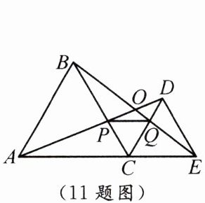 11. 如图,C 为线段 AE 上一动点(不与点 A,E 重合),在 AE 同侧分别作等边三角形 ABC 和等边三角形 CDE,AD 与 BE 相交于点 O,AD 与 BC 相交于点 P,BE 与 CD 相交于点 Q,连接 PQ.有以下五个结论:①AD = BE;②PQ // AE;③AP = BQ;④DE = DP;⑤∠AOB = 60°.其中恒成立的是