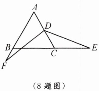 8. 如图,等边三角形 ABC 的边长为 5,D 是 AC 的中点,点 E,F 分别在 BC,AB 的延长线上,∠EDF = 120°,则 CE - BF 的值为