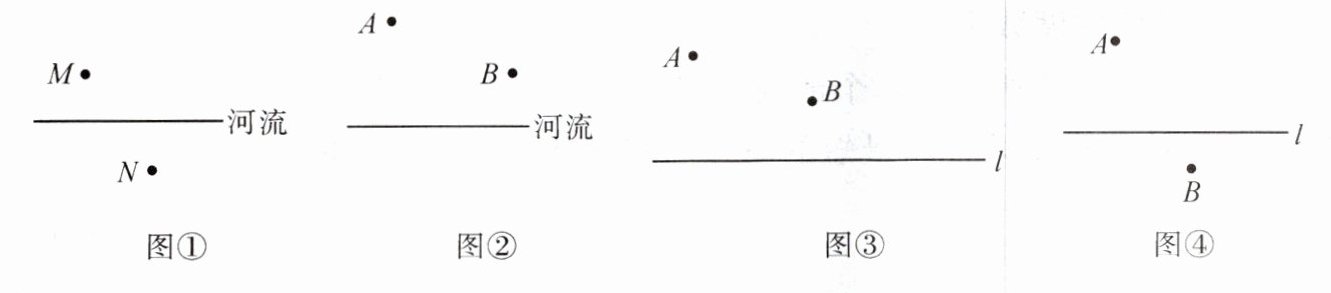 【实践运用】(1)如图①,M,N 两个小镇在河流的两侧.随着居民用水量的增加,现需要在河边修建一个自来水厂 P,分别向两个小镇供水.为了使铺设的水管最短,请在图中画出自来水厂 P 修建的位置.
