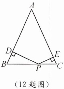 12. 如图,在△ABC中,AB=AC=2,P是BC边上任意一点,PD⊥AB,垂足为D,PE⊥AC,垂足为E。若△ABC的面积为$\frac{3}{2}$,则PD+PE的值为