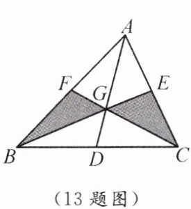 13. 如图,△ABC三边的中线AD,BE,CF的公共点为G。若$S_{△ABC}=12$,则图中阴影部分的面积是