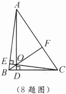 8. 如图,在△ABC中,AD⊥BC,CE⊥AB,垂足分别为D和E,AD与CE相交于点O,连接BO并延长交AC于点F。若AB=5,BC=4,AC=6,则CE:AD:BF=