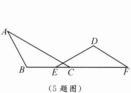 5. 如图,$\triangle ABC \cong \triangle FDE$,$B$,$E$,$C$,$F$在同一直线上。若$DE = 3$,$AC = 5$,$CE = 1$,则$BF$的长为()