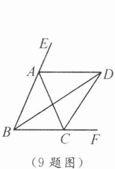 9. 如图,在$\triangle ABC$中,$\angle ABC = \angle ACB$,$AD$平分$\angle EAC$,$BD$平分$\angle ABC$,$CD$平分$\angle ACF$.有以下结论:①$AD// BC$;②$\angle ACB = 2\angle ADB$;③$\angle ADC = 90^{\circ} - \angle ABD$;④$\angle BDC = \frac{1}{2}\angle BAC$.其中正确的结论有