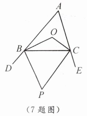 7. 如图,$\triangle ABC$两个内角的平分线$BO$,$CO$相交于点$O$,两个外角的平分线$BP$,$CP$相交于点$P$,则$\angle A$,$\angle P$,$\angle O$之间的数量关系是