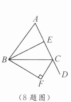 8. 如图,在$\triangle ABC$中,$BE$平分$\angle ABC$,$CF$平分$\angle BCD$,$BF\perp CF$,垂足为$F$.若$\angle A = 62^{\circ}$,则$\angle EBF$的度数是